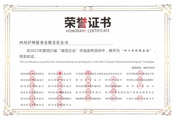 ? ? ? ?誠實守信,榜樣先行。近期,四川省發(fā)展改革委等25部門聯(lián)合發(fā)布2021年度 “誠信企業(yè)”評選結(jié)果,瀘州港務公司成功獲評2021年度“四川省誠信企業(yè)”。