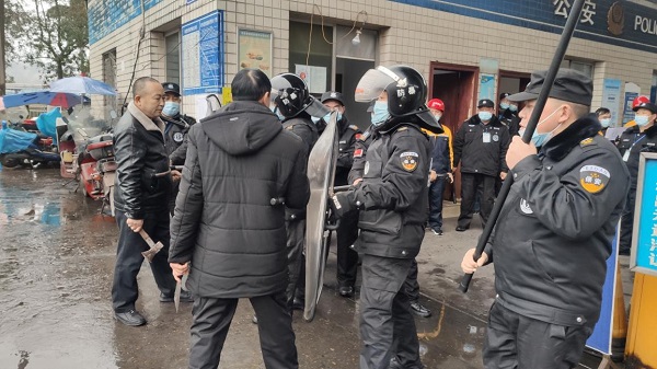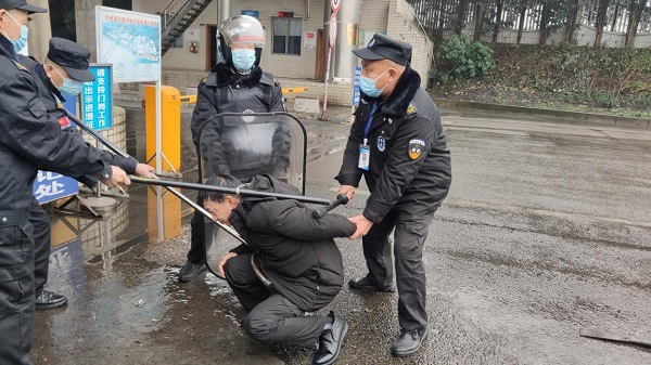 ? ? ? ?上午10時(shí),演練正式開(kāi)始。2名“持刀恐怖分子”企圖強(qiáng)行闖閘進(jìn)港,值班保安立即上前阻攔,并第一時(shí)間向反恐防暴應(yīng)急值班室報(bào)告。接到信息后,公司迅速組織港口安保人員裝備盾牌、鋼叉、防暴槍等警械趕往現(xiàn)場(chǎng),與“恐怖分子”展開(kāi)抵抗和搏斗,最終將其制服。
